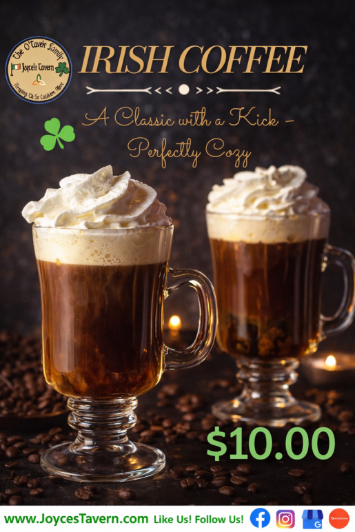 Savor the warmth of joy with Joyce's Irish Coffee! Indulge in a heavenly blend of rich flavors that will uplift your spirits.