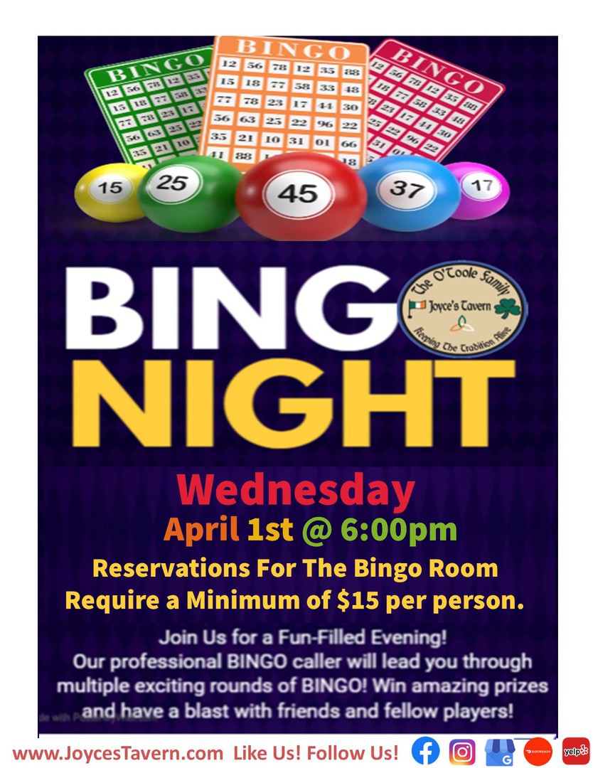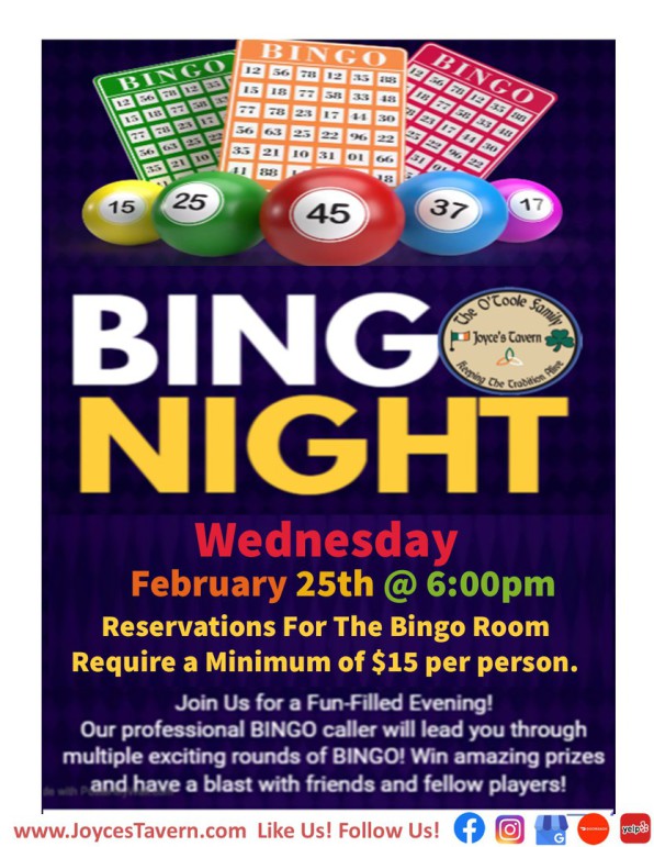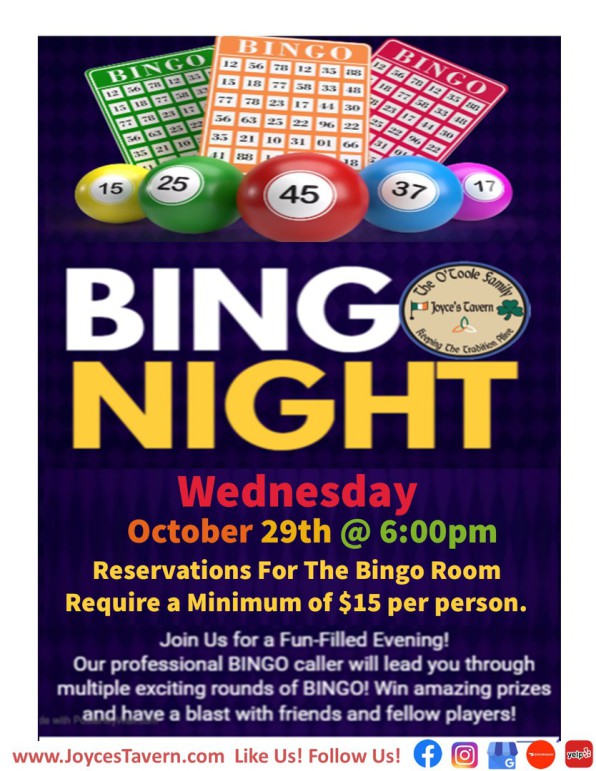 Reservations For The BINGO Room Require a Minimum of $15 Per Person