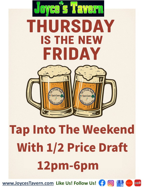 Kickstart your weekend with great drinks, tasty bites, and good vibes at Joyce's!