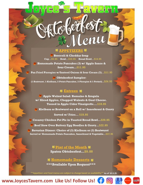 As the leaves change and the air turns crisp, it's time to savor the flavors of fall at Joyce's Tavern. Throughout October, we're serving up a mouthwatering selection of season delights that will warm your your taste buds.
