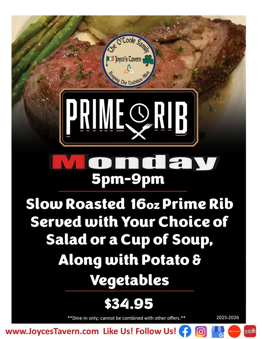 Slow Roasted 16oz Prime Rib. Served with Your Choice of Salad or a Cup of Soup, along With Potato & Vegetables.